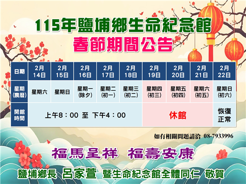 一、春節休館時間:115年2月19日至2月21日(農曆正月 初三至正月初五)共計3日。 二、春節休館期間停止辦理本鄉各項殯葬業務,倘欲辦理祭 拜、選 位、進塔、遷出、或公墓起掘等事項,請於 115年2月18日以前或2月22 日以後再洽本鄉殯葬所管 理中心辦理。
